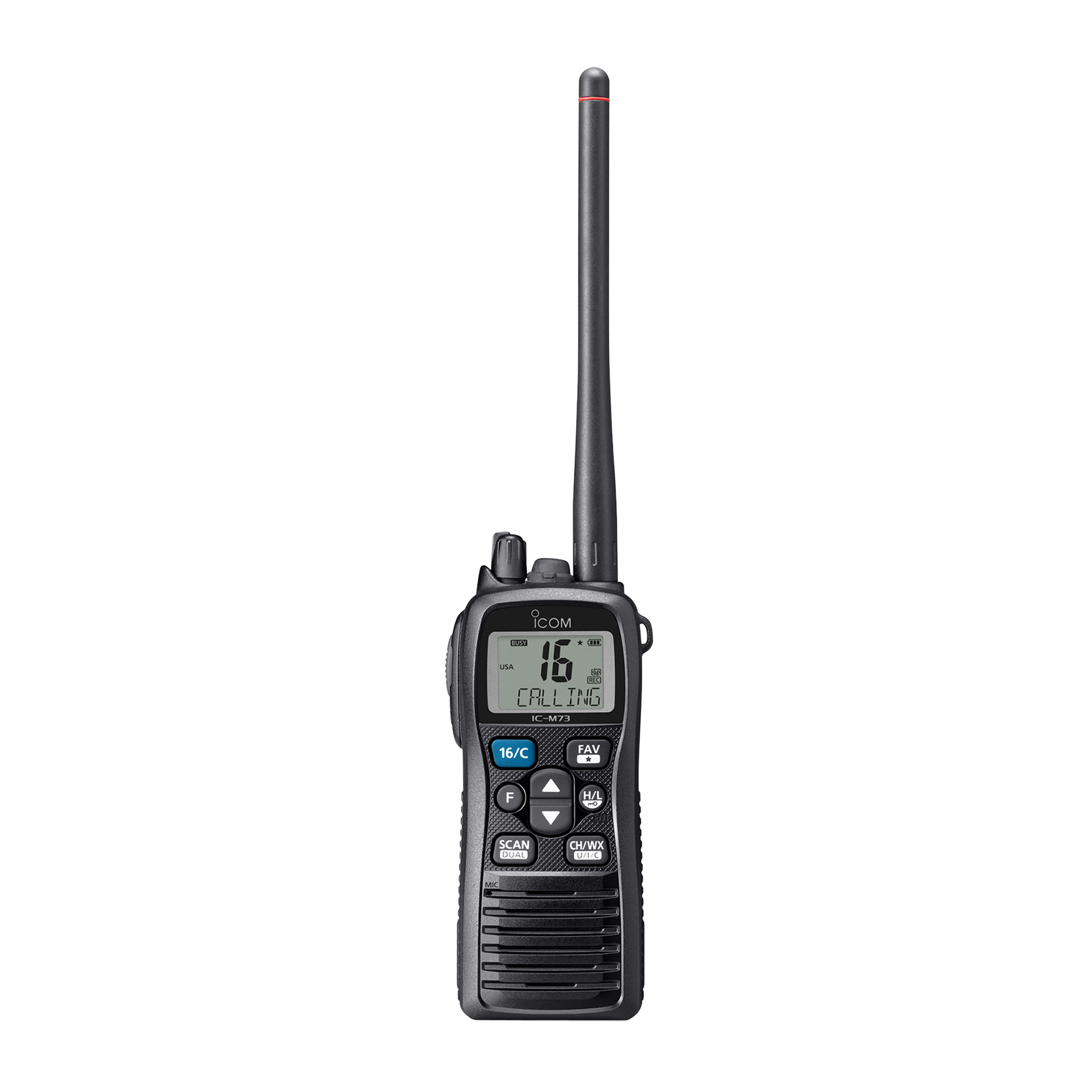 The Icom M73 is a powerful and stylish VHF marine handheld radio that combines professional features with a compact, ergonomic design. It boasts the highest available 6W RF output power in its class, providing extended communication range essential for safety and coordination at sea. Its rugged construction meets MIL-STD 810 military standards for durability.